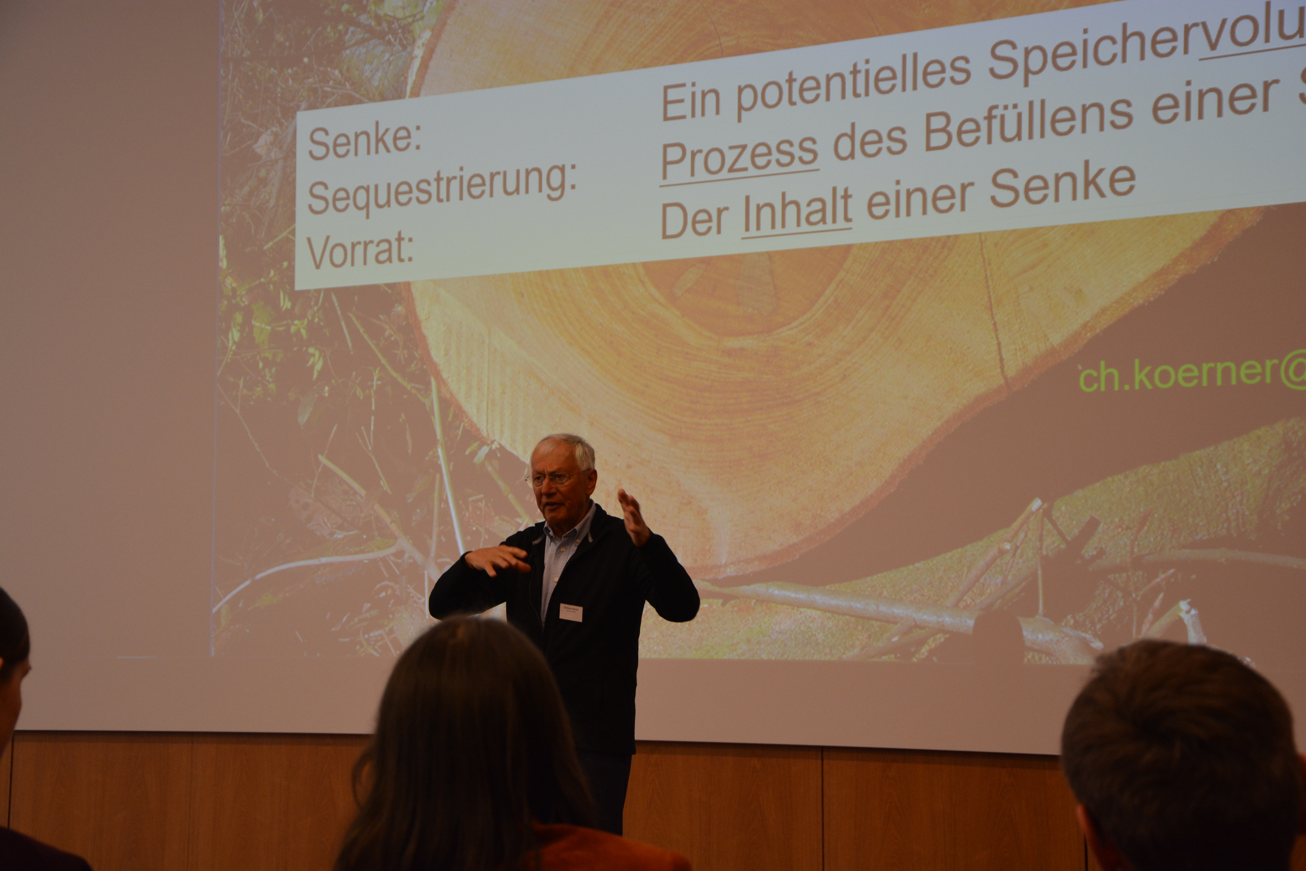 Bildunterschrift: Prof. Dr. Christian Körner von der Universität Basel bei seinem Keynote-Vortrag zum Thema "Der Wald eine Kohlenstoffsenke - ist er das?" (Foto: Inge Kehr)