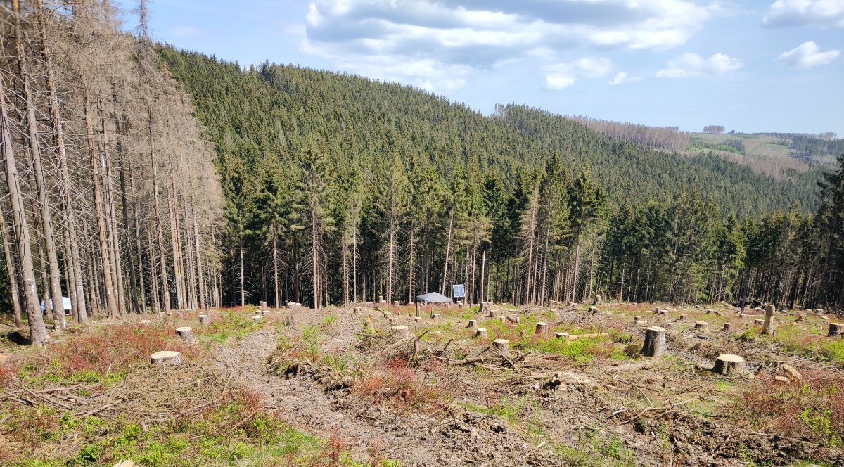 Bildunterschrift: Die großflächigen Schäden an Fichtenbeständen in Mittelgebirgen sind eine bedeutende Herausforderung für ein klimaangepasstes Waldmanagement. Im Vordergrund des Bildes ist ein frisch geräumter Fichtenbestand zu erkennen. Am linken Bildrand ein Bereich mit Dürrständern (abgestorbene Fichten) und im Hintergrund aktuell noch vitale Fichtenbestände (Foto: Olaf Schwerdtfeger).