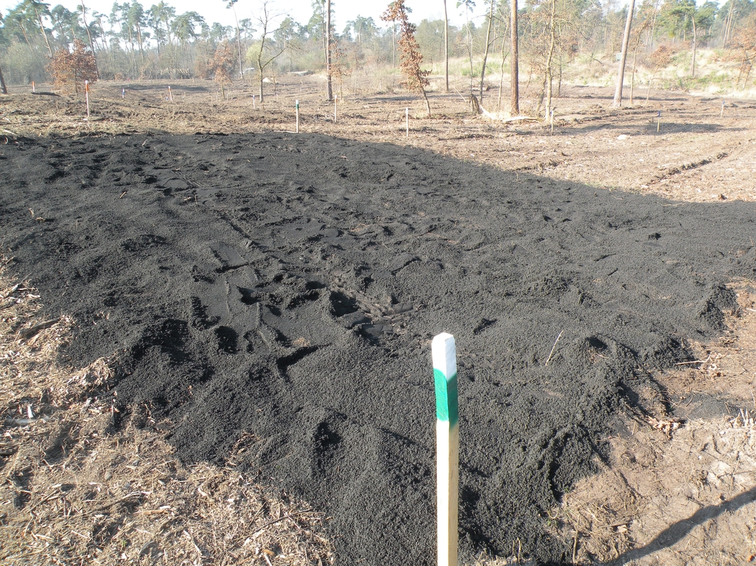 - Es werden mögliche Strategien erprobt, die nicht nur den Anwuchserfolg verbessern, sondern zugleich stabilen Kohlenstoff in SOC-(soil organic carbon)-armem Boden anreichern und speichern. Die durch Pyrolyse aus Biomasse erzeugte Biokohle ist sehr zersetzungsstabil. Somit wird der Atmosphäre dauerhaft Netto-CO2 entzogen.