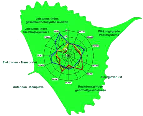 In unserem Projekt wird eine weiterentwickelte biophysikalische Methode auf Basis von CF-Emissionen zur schnellen Erfassung von Leistungsparametern der Photosynthese eingesetzt. Eine Einzelmessung dauert dabei nur eine Sekunde. Innerhalb kürzester Zeit sind dadurch größere Pflanzenbestände erfassbar. Im Gegensatz zu den herkömmlichen CF-Messgeräten, bei denen nur ein einziger verwertbarer Parameter und dessen abgeleitete Parameter je Messvorgang berechnet werden, sind mit dem hier verwendeten feldtauglichen CF-Messgerät „Pocket PEA, Hansatech GB“ mehr als 30 verschiedene Parameter erfassbar. Da pro Einzelmessung 120-140 Messpunkte aufgezeichnet werden (im Gegensatz zu zwei Messpunkten mit der veralteten Methodik), ist eine viel tiefgreifendere Analyse der biophysikalischen Abläufe durch Verrechnung innerhalb neuester Formeln, wie Sie auch schon in der Grundlagenschrift von Strasser et al. 2008 erfolgreich beschrieben und angewandt wurden, möglich. Diese zusätzlichen Informationen über die Gesamtheit aller Photo-Systeme und der dazu gehörigen Elektronen-Transportwege, deren Kapazität und Effizienz, liefern eine sehr genaue Abschätzung des Zustandes und der Photosynthese-Leistung der Pflanzen in Bezug zu ihrer Umwelt und ihres Genotyps.