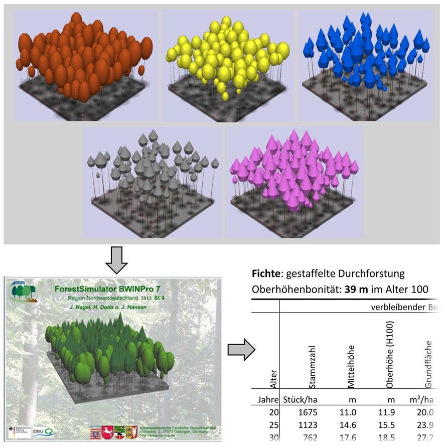 Ziel des Projektes ist es daher, eine neue Generation modellbasierter Ertragstafeln zu schaffen, welche für Rein- und Mischbestände der wichtigsten Waldentwicklungstypen im nordwestdeutschen Raum einfach zu handhabende und die heutigen Waldbaukonzepte widerspiegelnde Planungshilfen für die Forstbetriebe darstellen sowie Grundlagen für die Waldbewertung liefern und die Abschätzung der nachhaltigen Nutzungsmöglichkeiten ermöglichen. Eine dynamische, in Zeitintervallen von ca. 20 Jahren vorzunehmende zukünftige Neuparametrisierung der modellbasierten Ertragstafeln kann den fortschreitenden Veränderungen der Standort-Leistungsbeziehungen Rechnung tragen.
