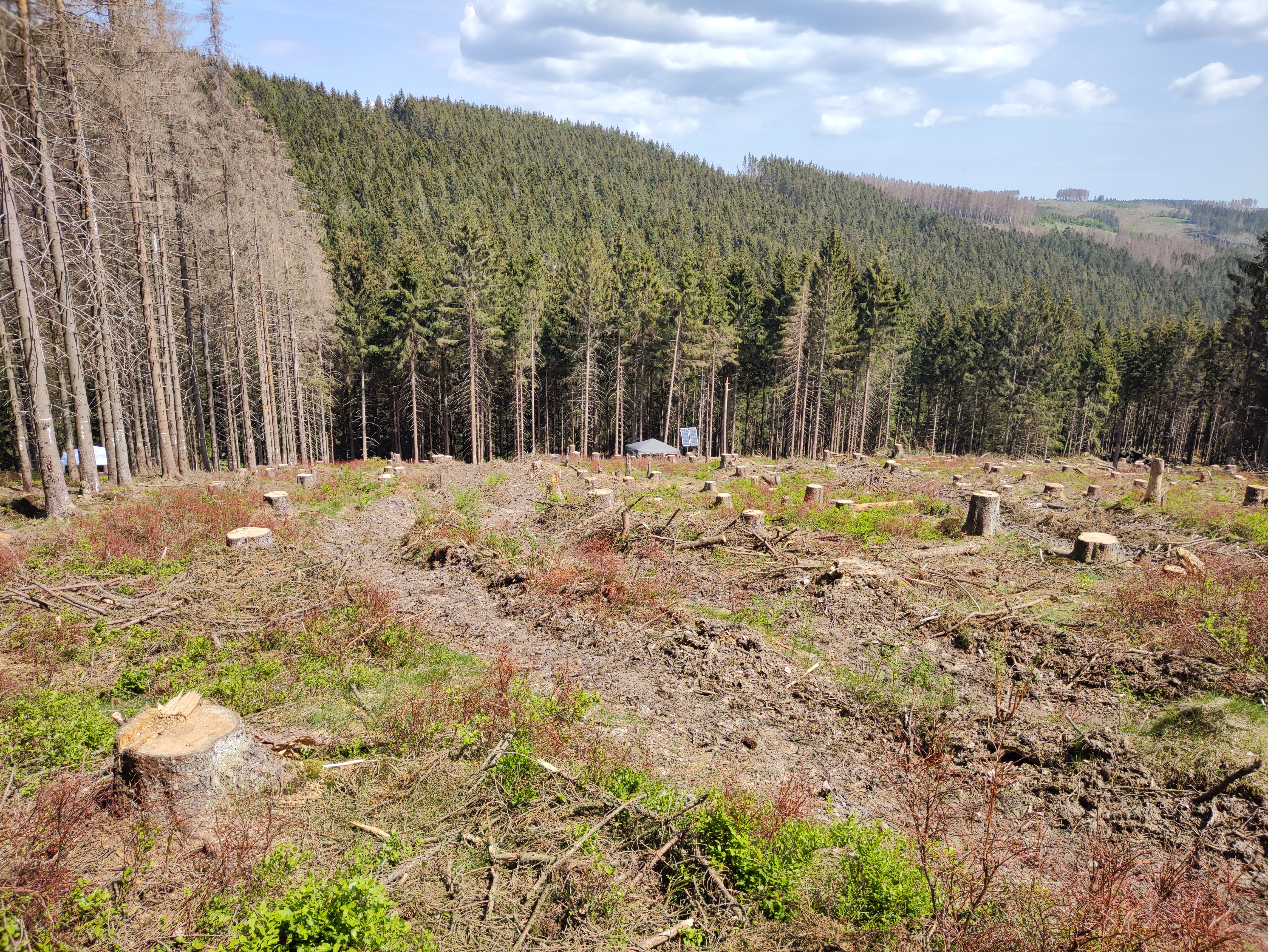 Bildunterschrift: Die großflächigen Schäden an Fichtenbeständen in Mittelgebirgen sind eine bedeutende Herausforderung für ein klimaangepasstes Waldmanagement. Im Vordergrund des Bildes ist ein frisch geräumter Fichtenbestand zu erkennen. Am linken Bildrand ein Bereich mit Dürrständern (abgestorbene Fichten) und im Hintergrund aktuell noch vitale Fichtenbestände (Foto: Olaf Schwerdtfeger).