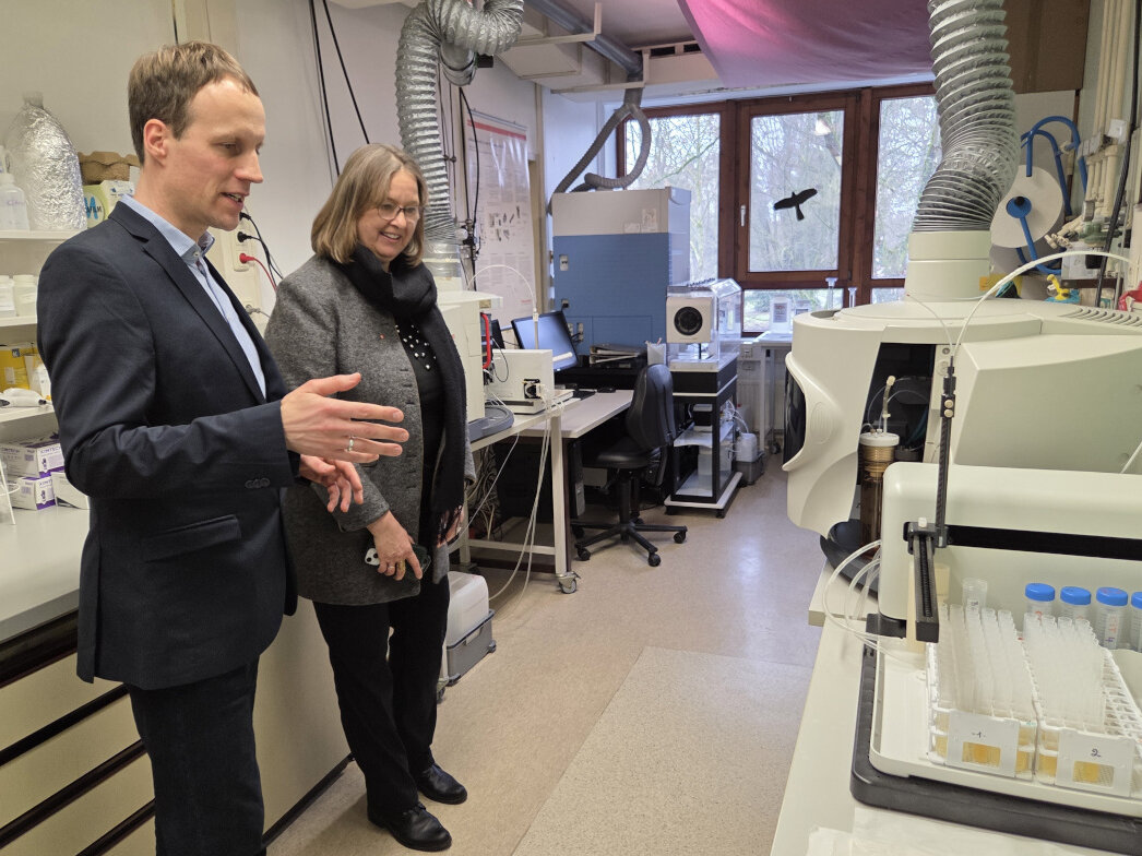 Auf einem Rundgang wurde das Labor der Abteilung Umweltkontrolle vorgestellt. Dort werden Analysen von Boden-, Humus-, Pflanzen- und Wasserproben durchgeführt. Der größte Teil der Proben stammt aus den Umweltmonitoring-Programmen der vier Trägerländer und wird mit standardisierten Methoden unter Einsatz modernster Analysegeräte untersucht. Anhand der Ergebnisse können Aussagen zur Nährstoffverfügbarkeit, Schadstoffbelastung und Versauerung unserer Waldökosysteme getroffen werden. Bei dem Rundgang wurde an drei Arbeitsstationen anschaulich gemacht, wie die Nährstoffverfügbarkeit eines Waldstandorts konkret im Labor bestimmt wird.